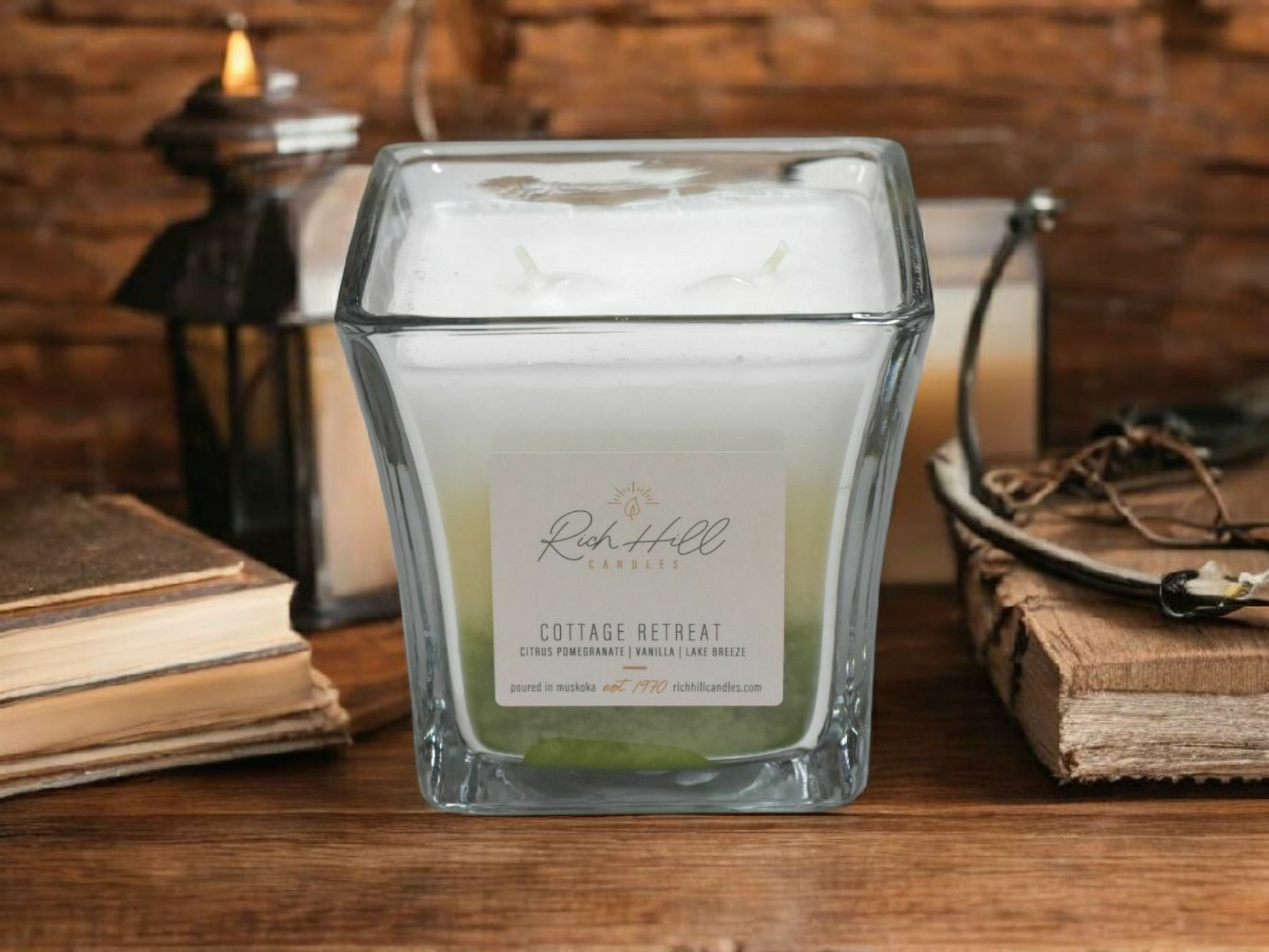 Triple layer candles with Citrus & Pomegranate, Vanilla and Lake Breeze scents. Candles come in white, ivory, and sage green coloured layers.