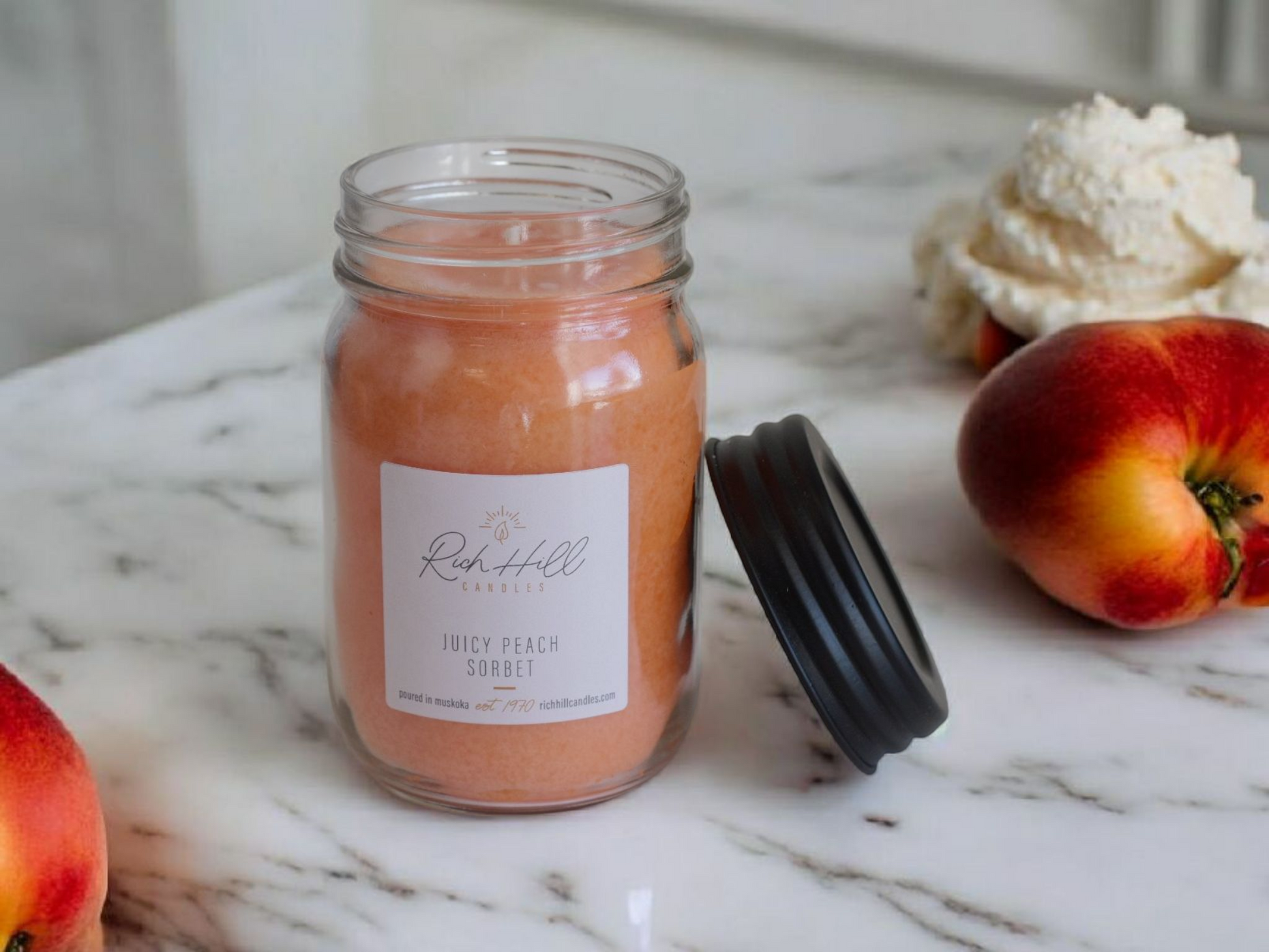 Fresh cut peaches with ice cream. Candles come in a peach colour.