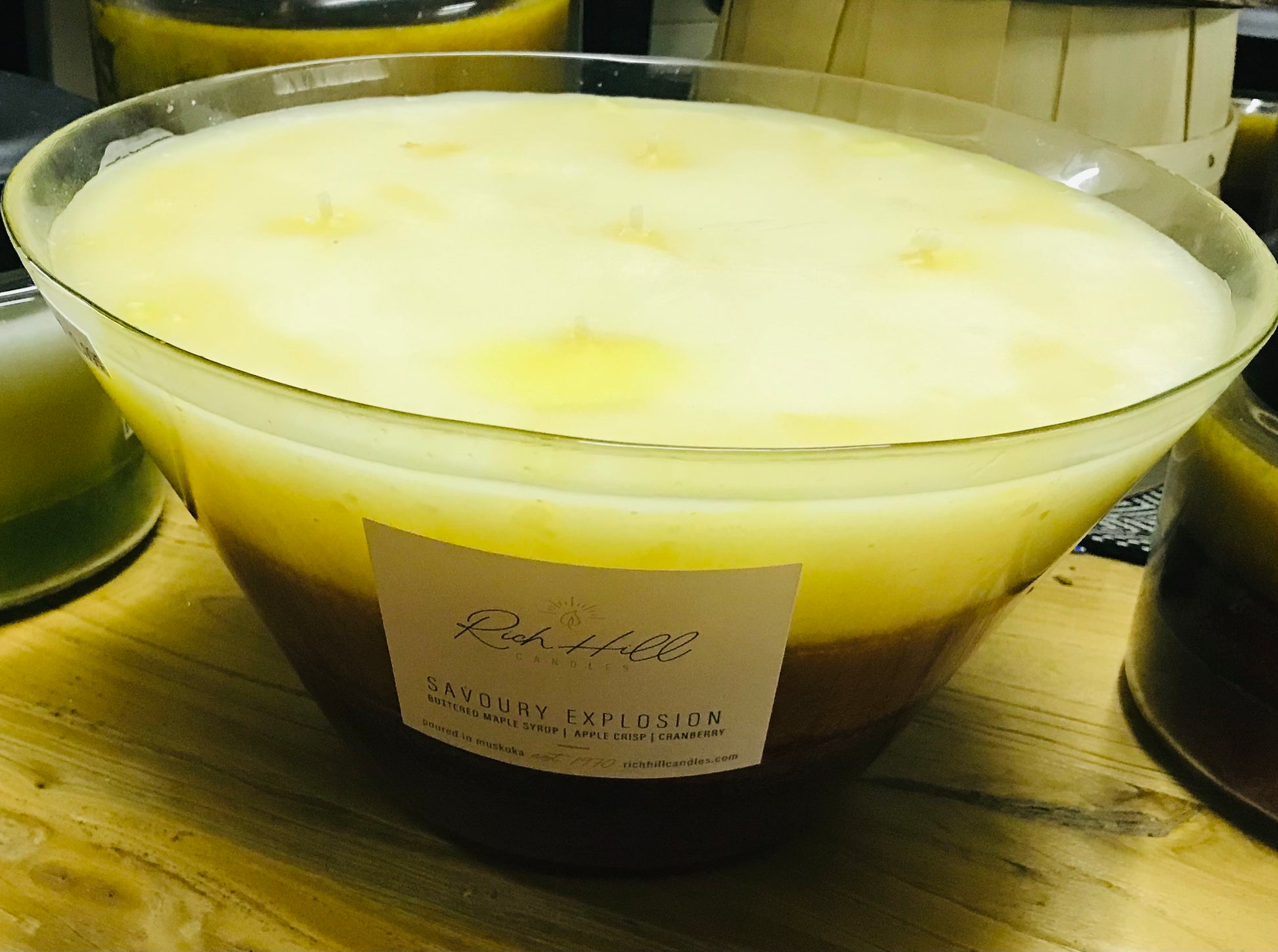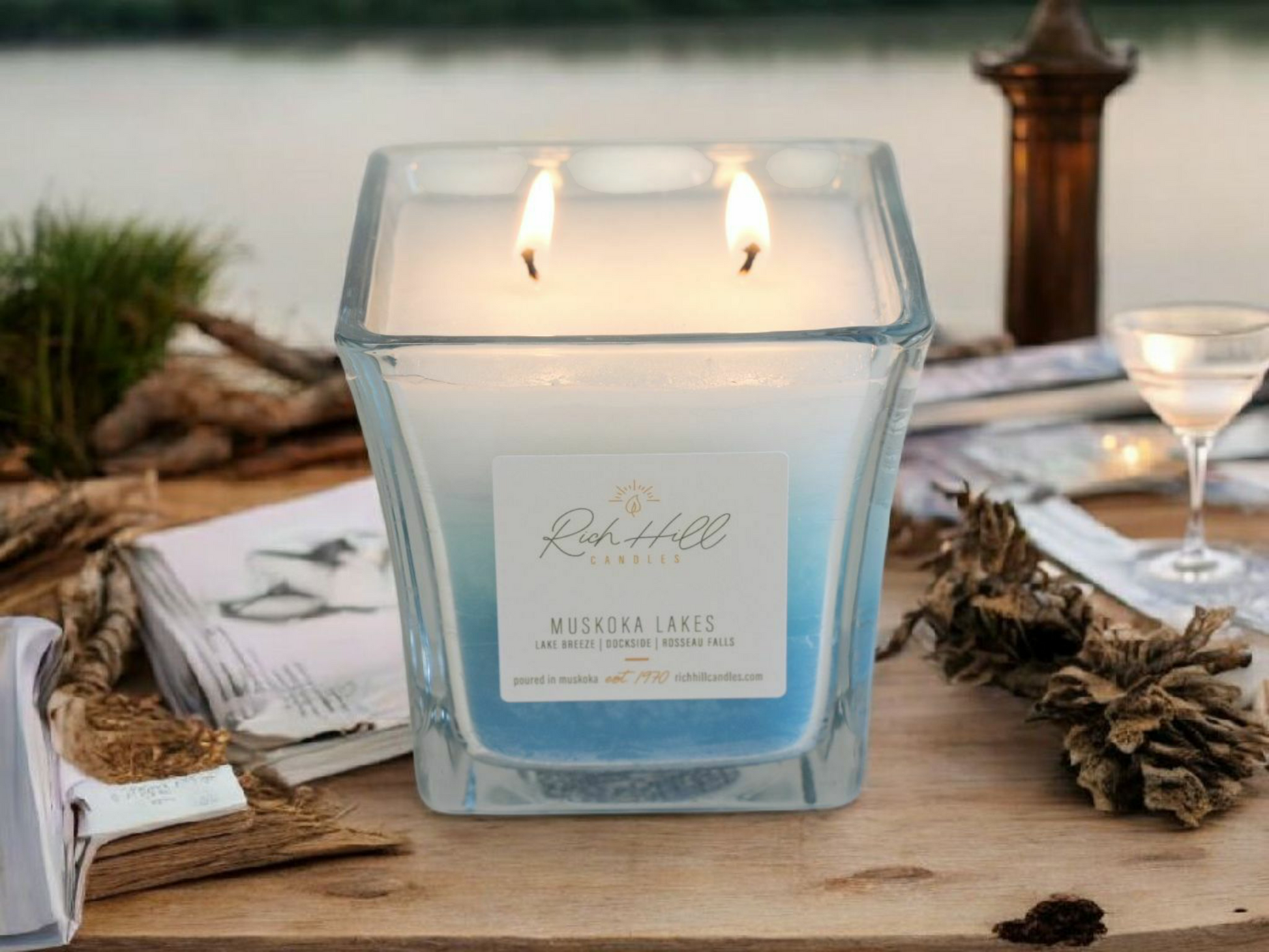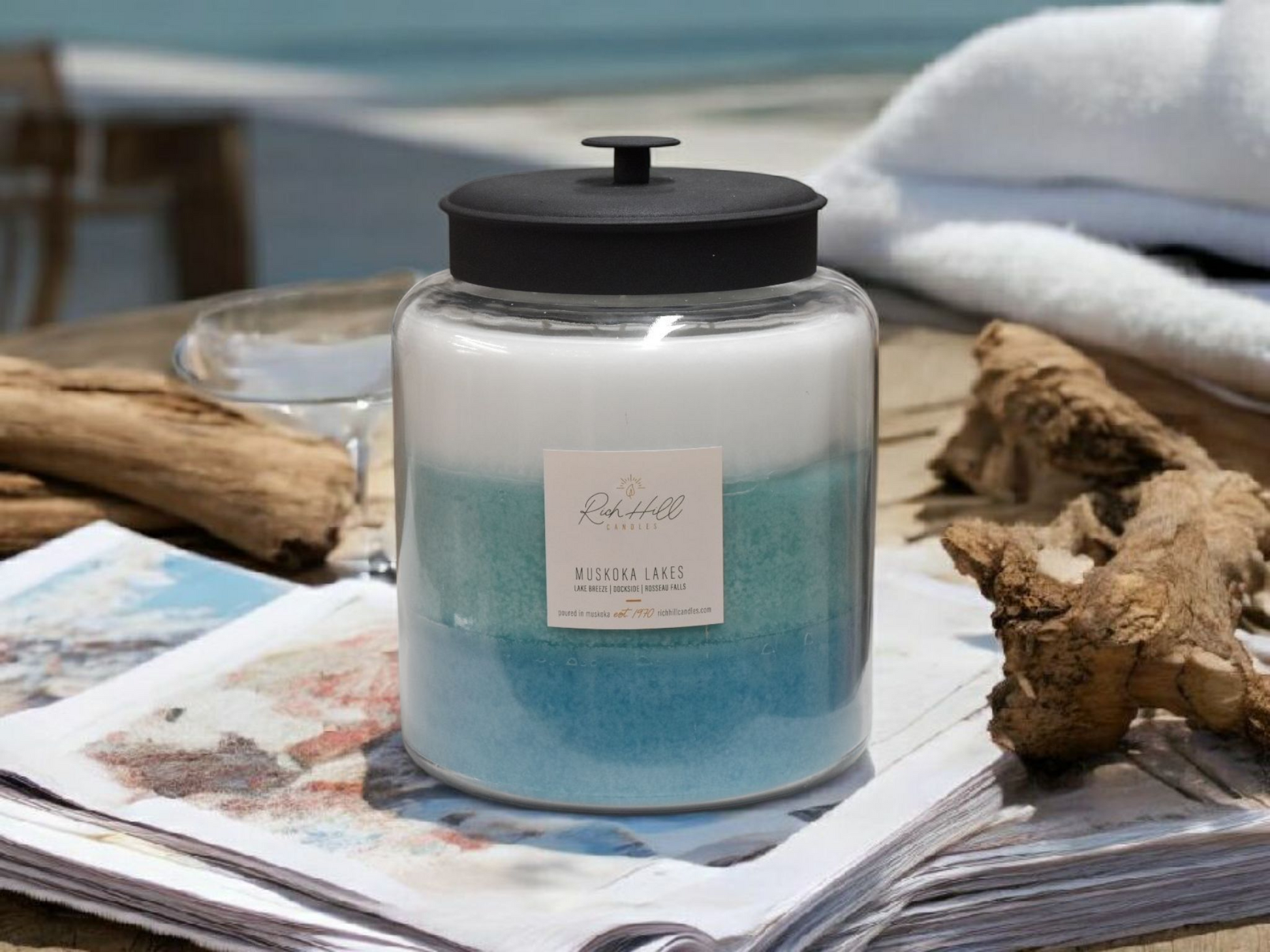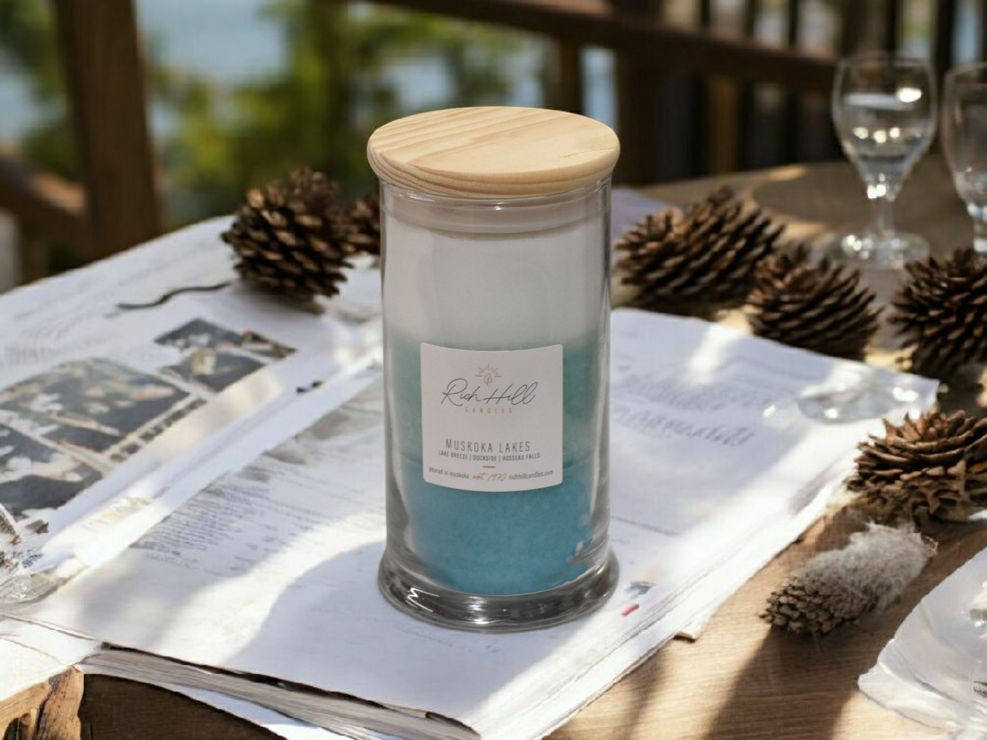 Triple layer candles with Lake Breeze, Dockside and Rosseau Falls scents. Candles come in white, teal and turquoise coloured layers.