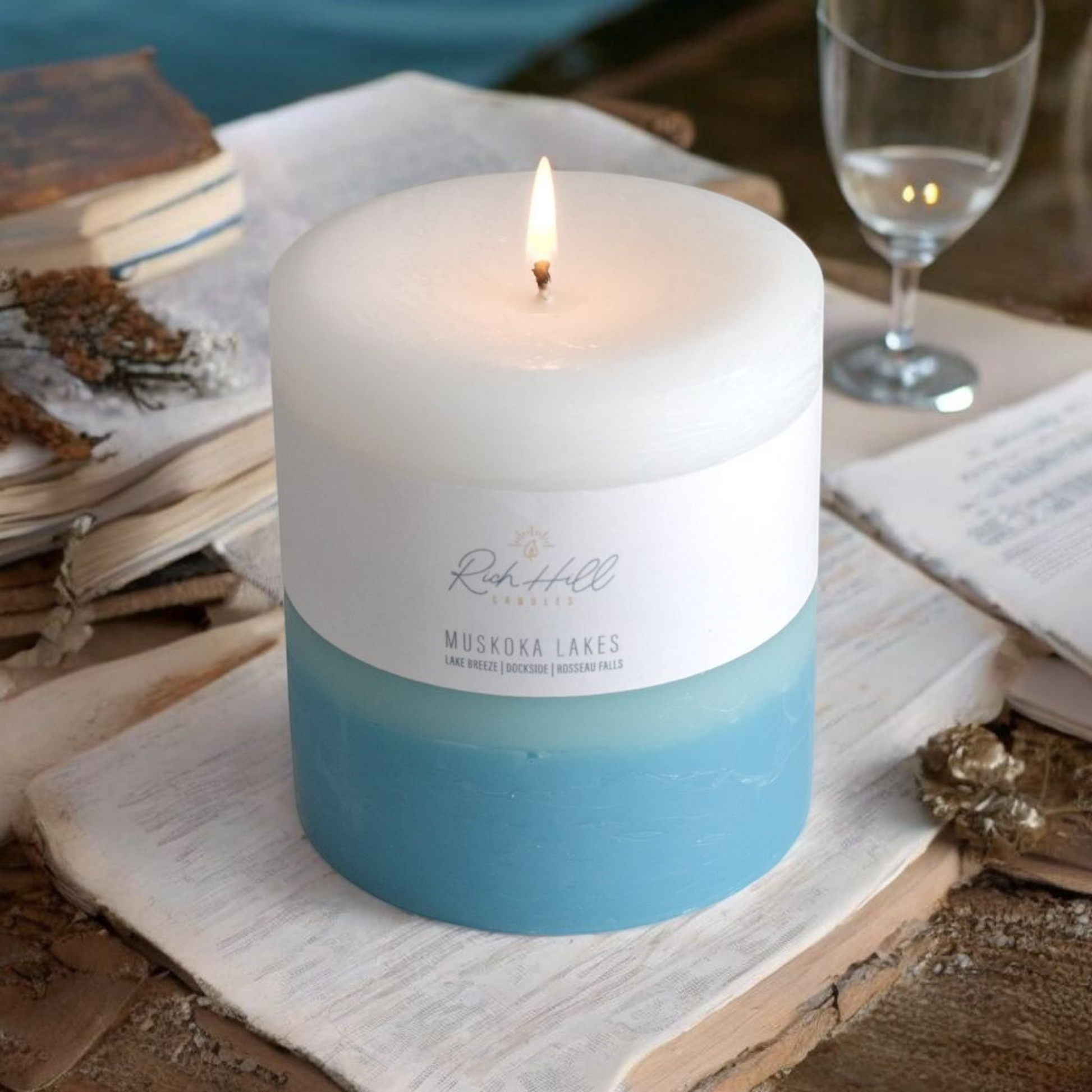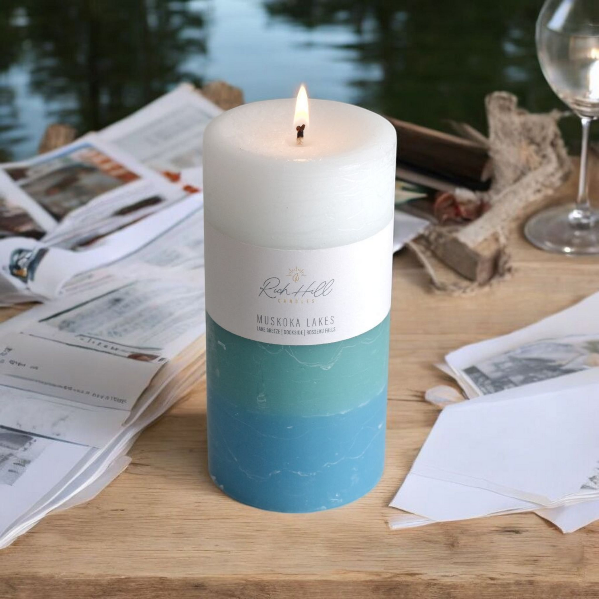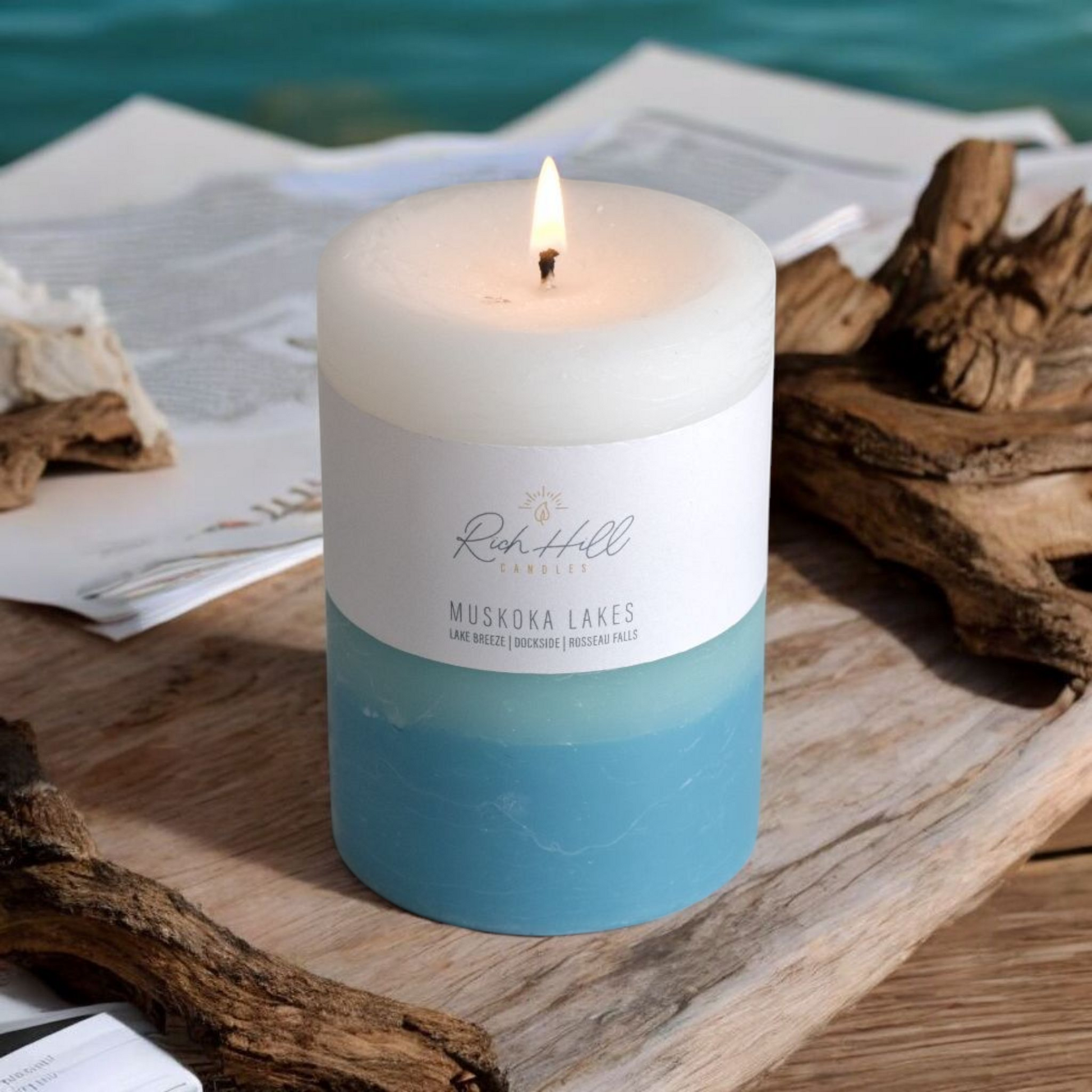 Triple layer candles with Lake Breeze, Dockside and Rosseau Falls scents. Candles come in white, teal and turquoise coloured layers.