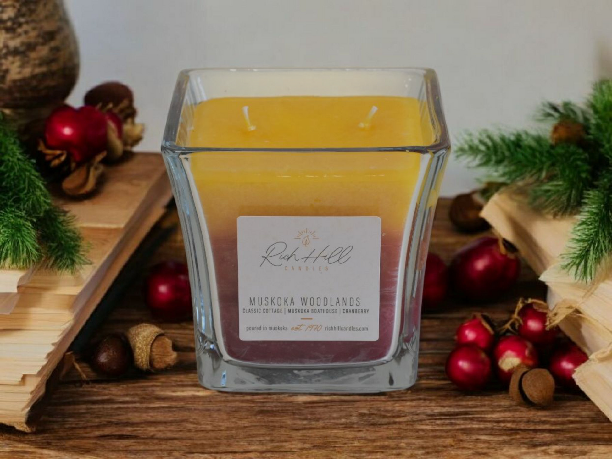 Triple layer candles with Classic Cottage, Muskoka Boathouse and Cranberry scents. Candles come in harvest gold, rust and burgundy coloured layers.