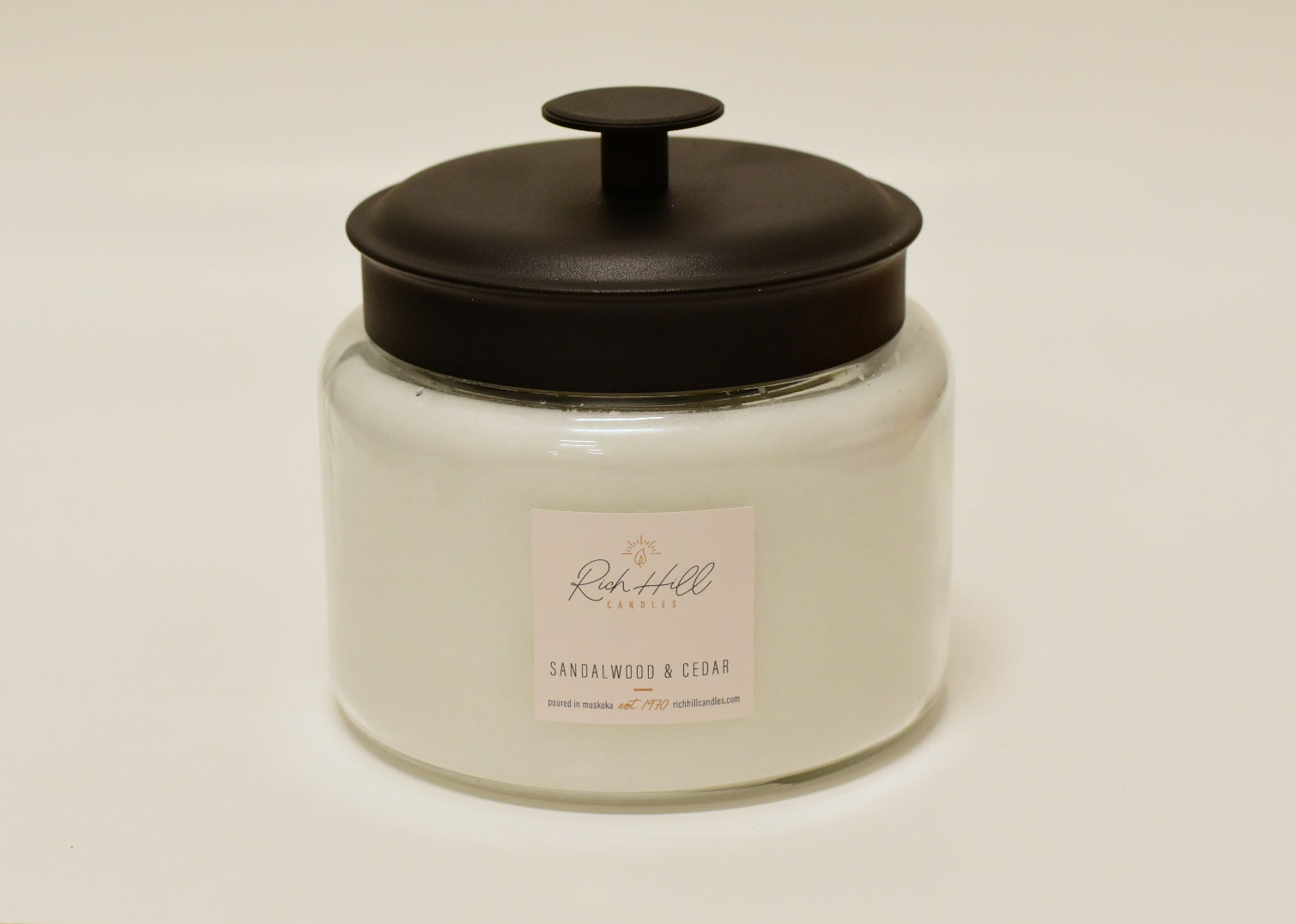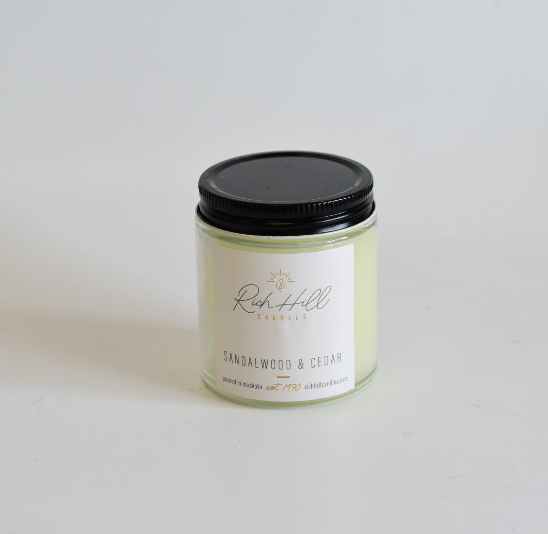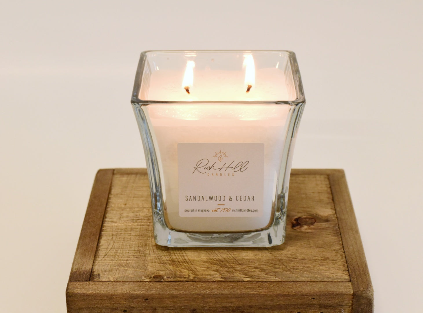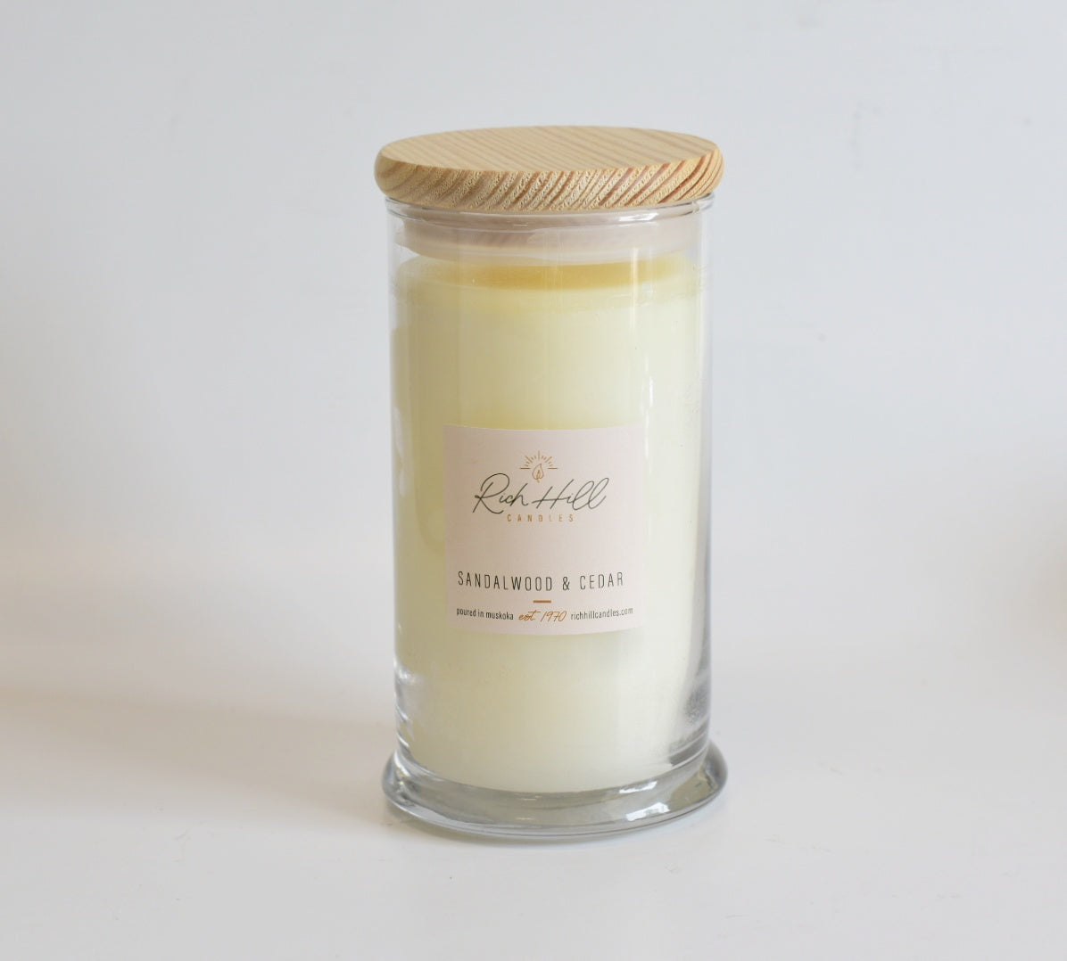 Deep, woody sandalwood infused with fresh cut cedar aroma. Candles come in a beige colour.