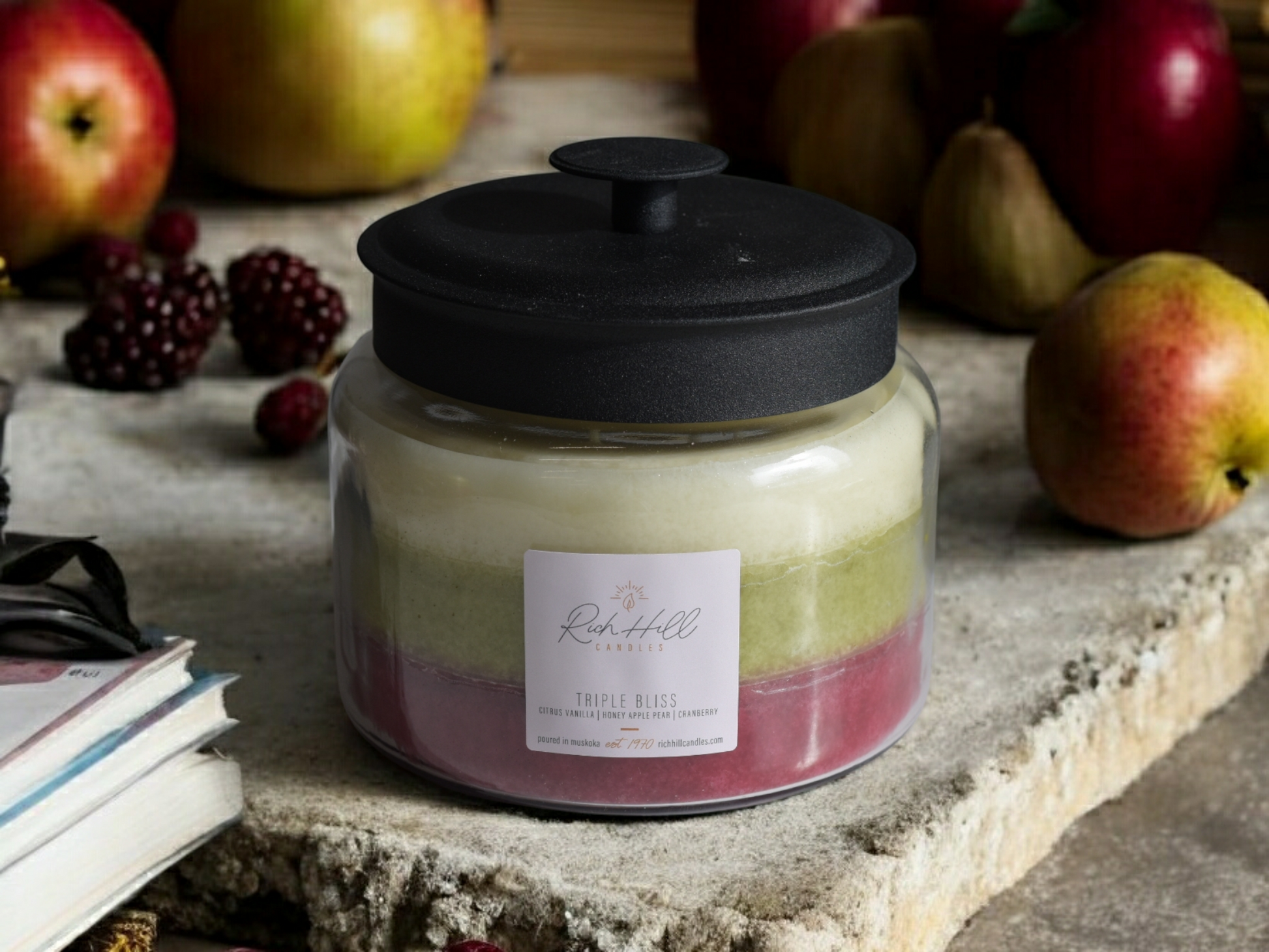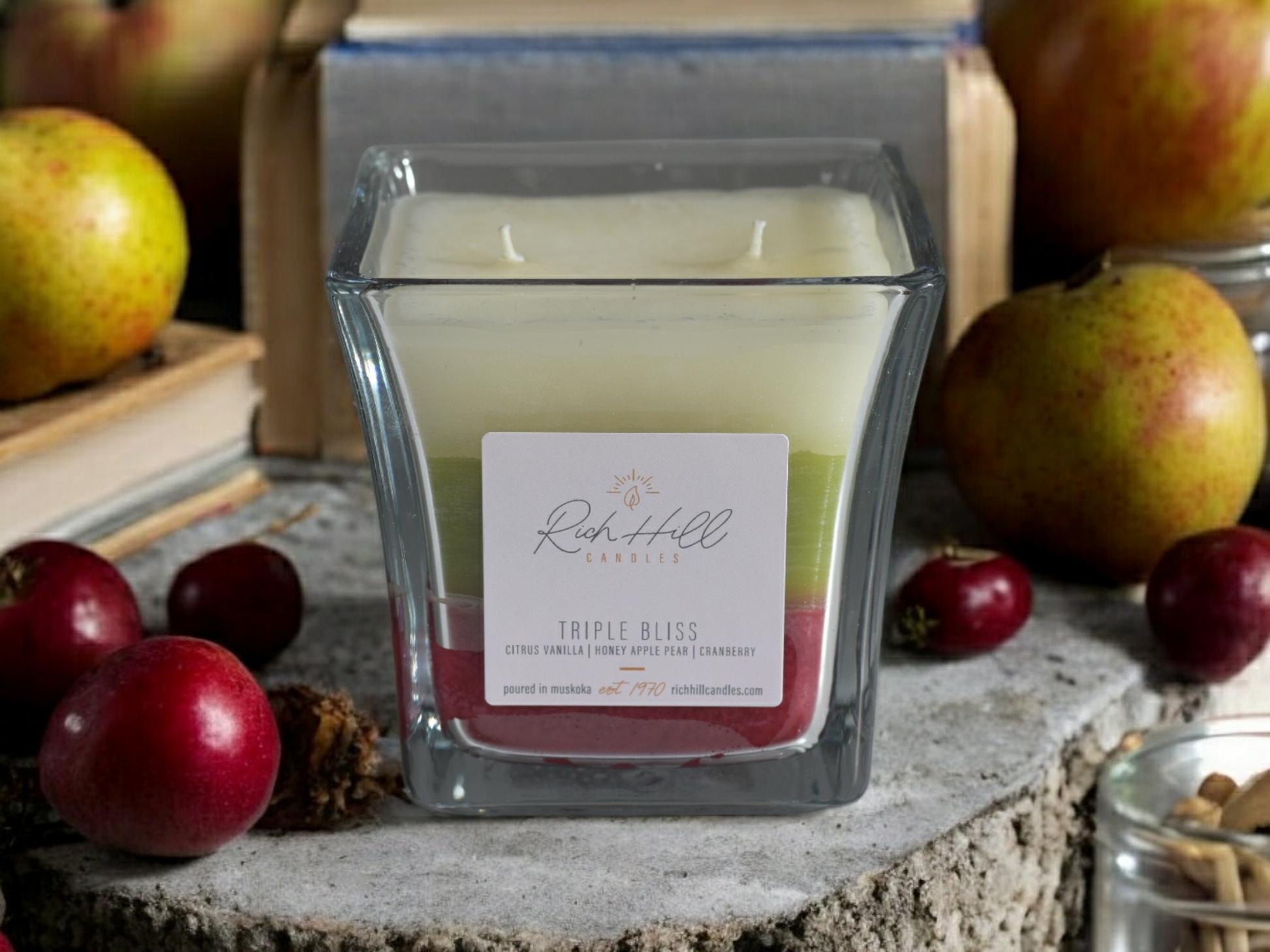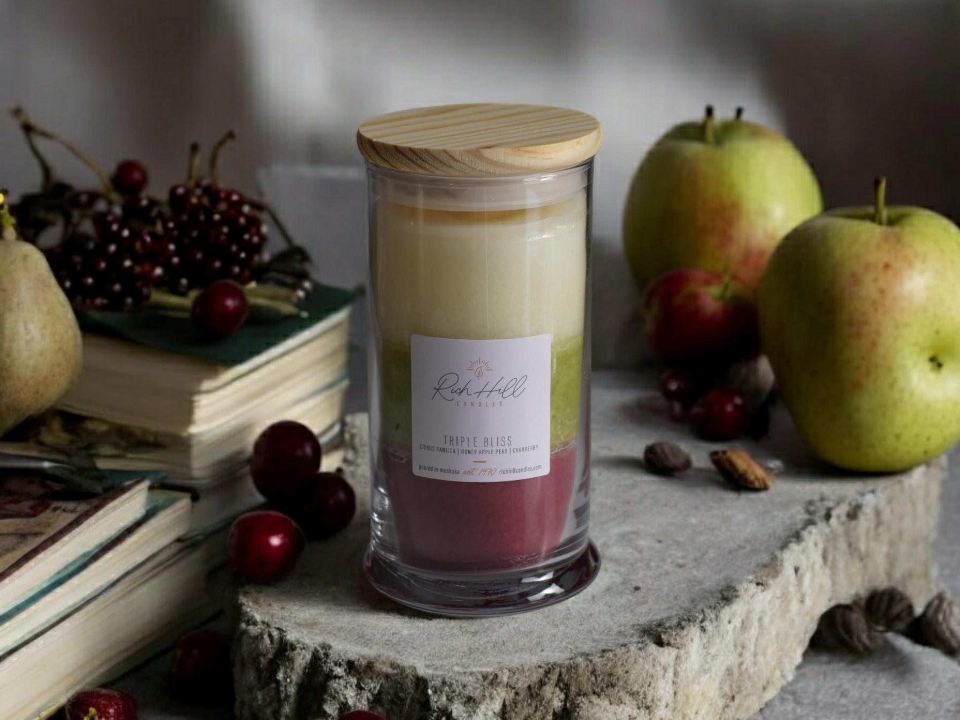 Triple layer candles with Citrus Vanilla, Honey Apple Pear and Cranberry scents. Candles come in Ivory, Sage Green and Burgundy coloured layers.