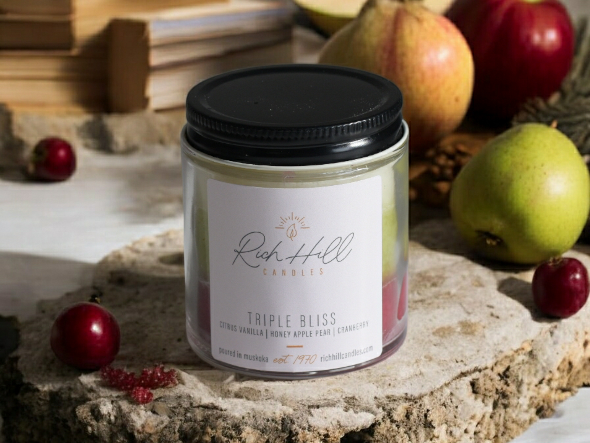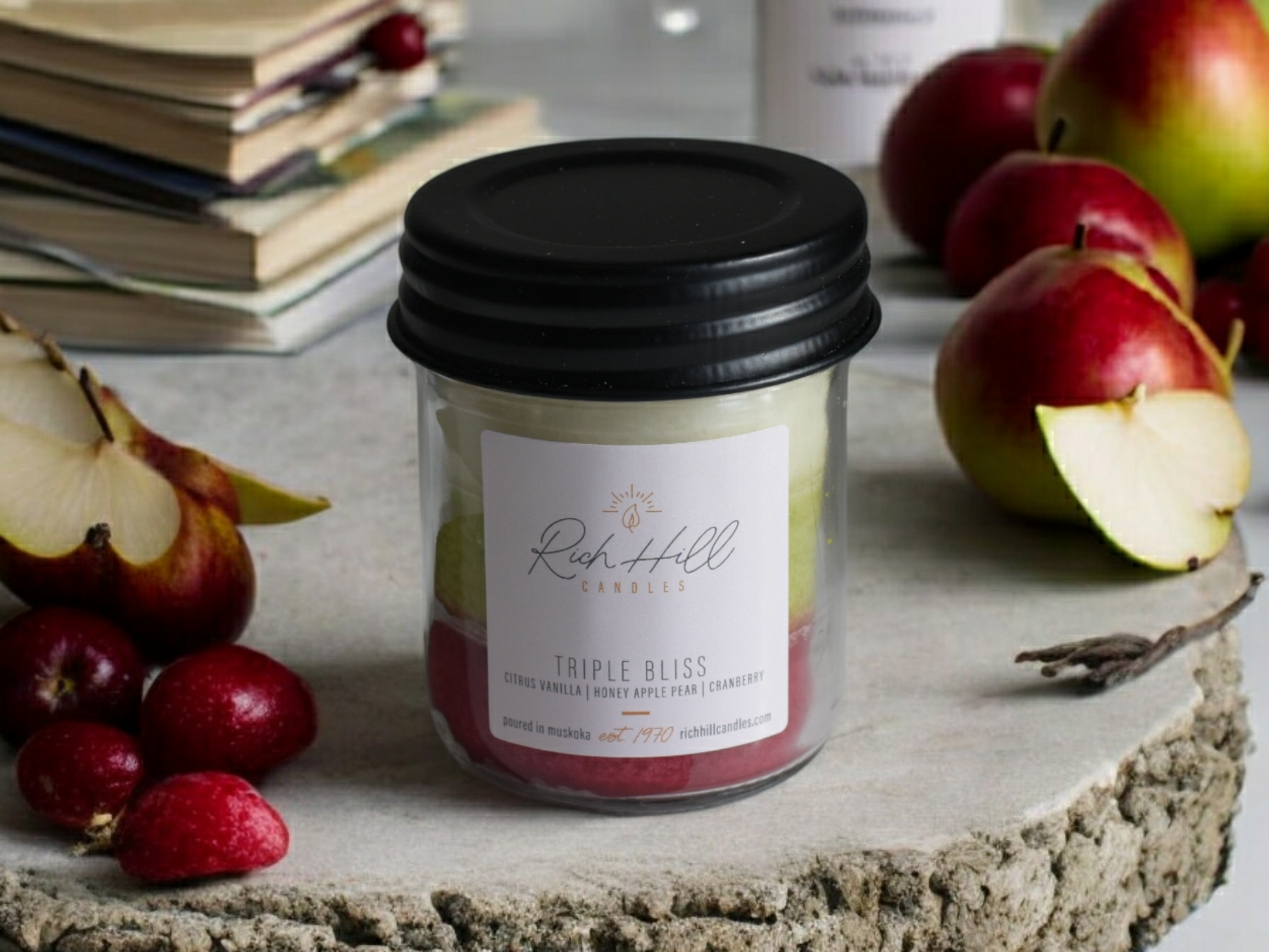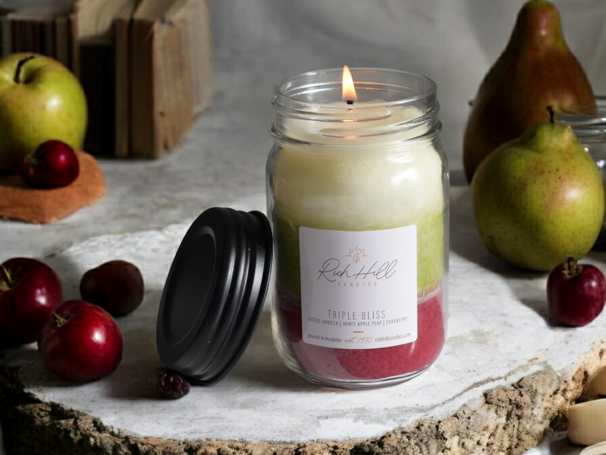 Triple layer candles with Citrus Vanilla, Honey Apple Pear and Cranberry scents. Candles come in Ivory, Sage Green and Burgundy coloured layers.