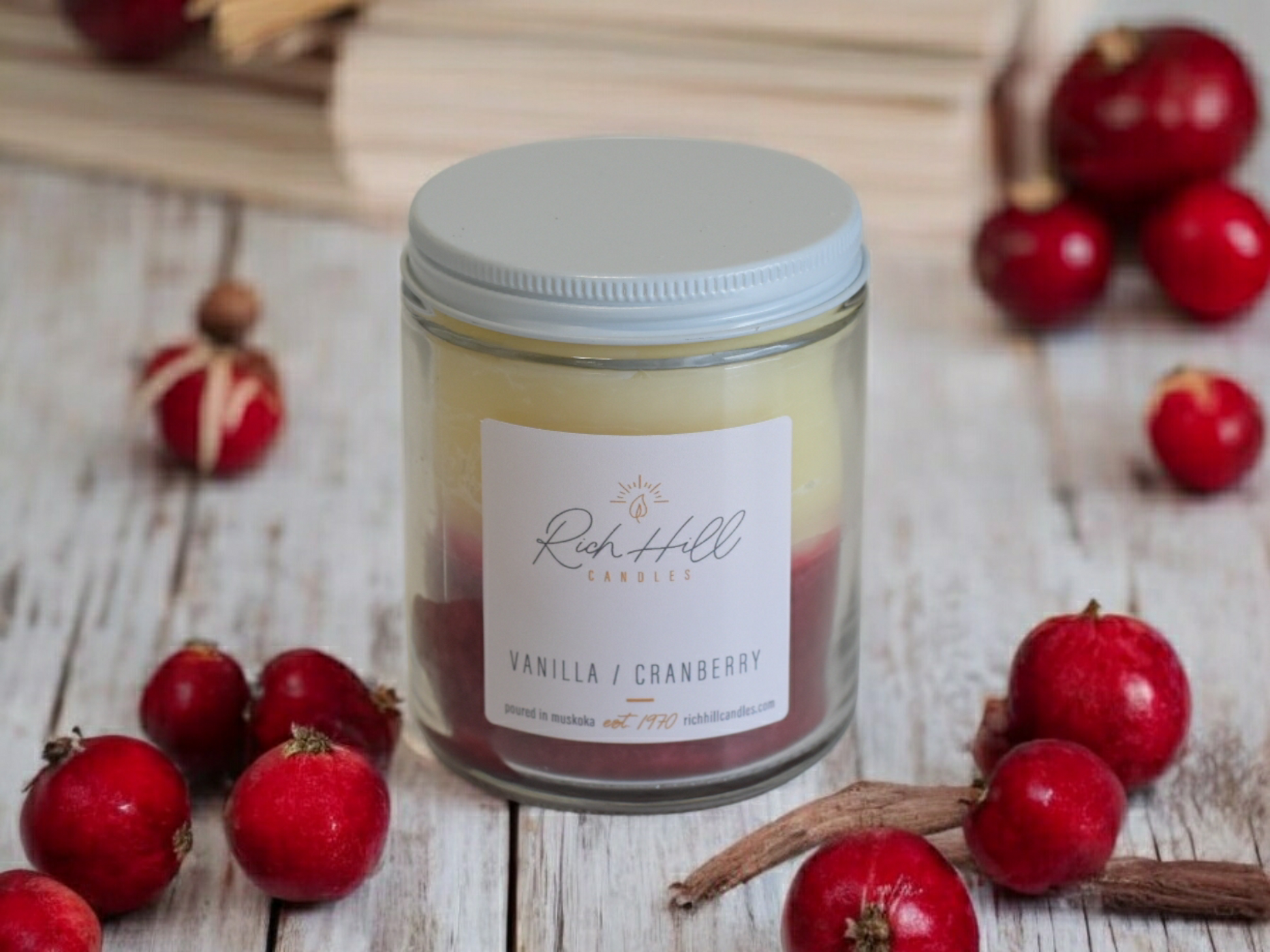 Buttery vanilla and crisp cranberry aroma. Candles come in an ivory layer and burgundy layer.